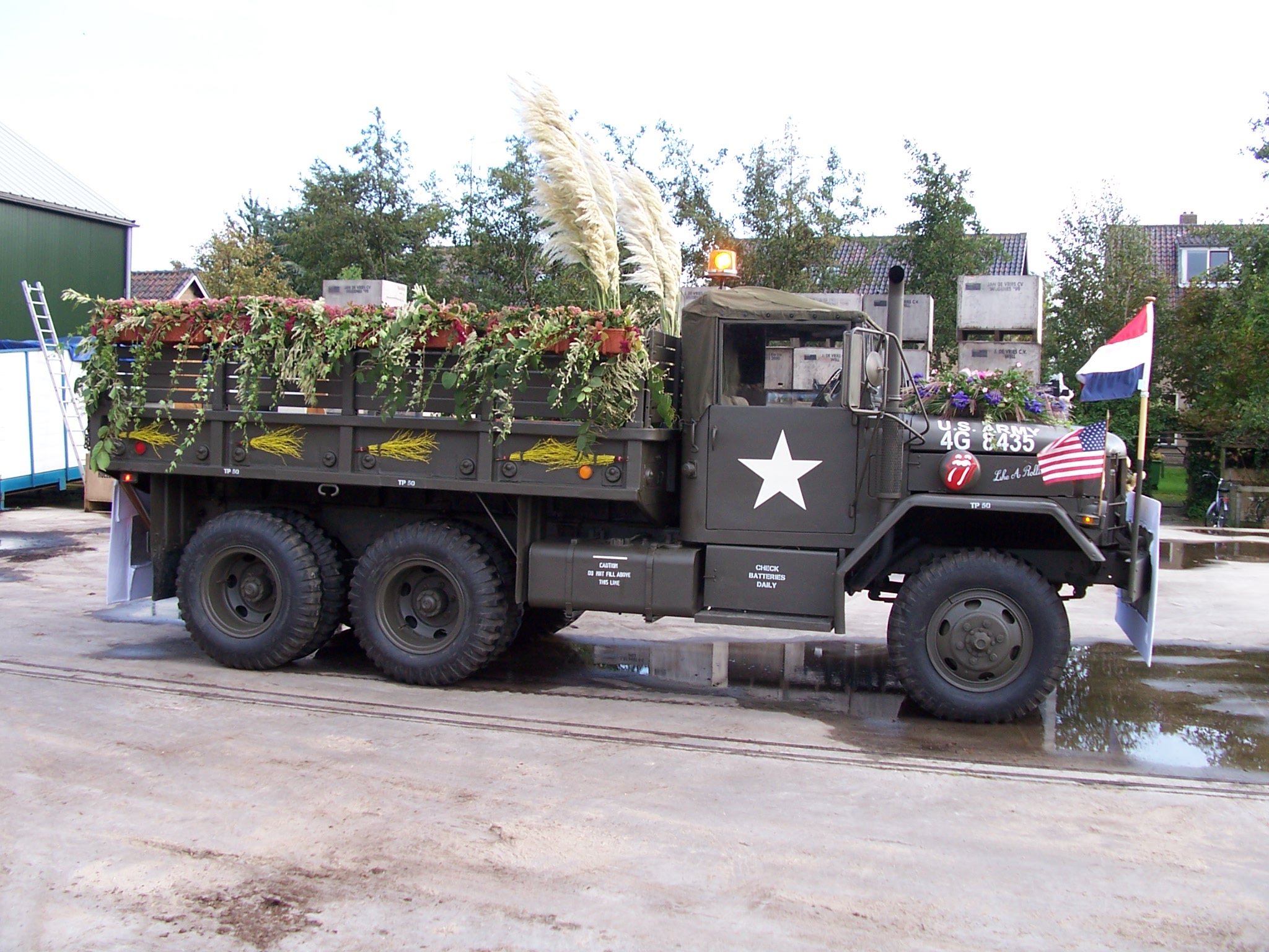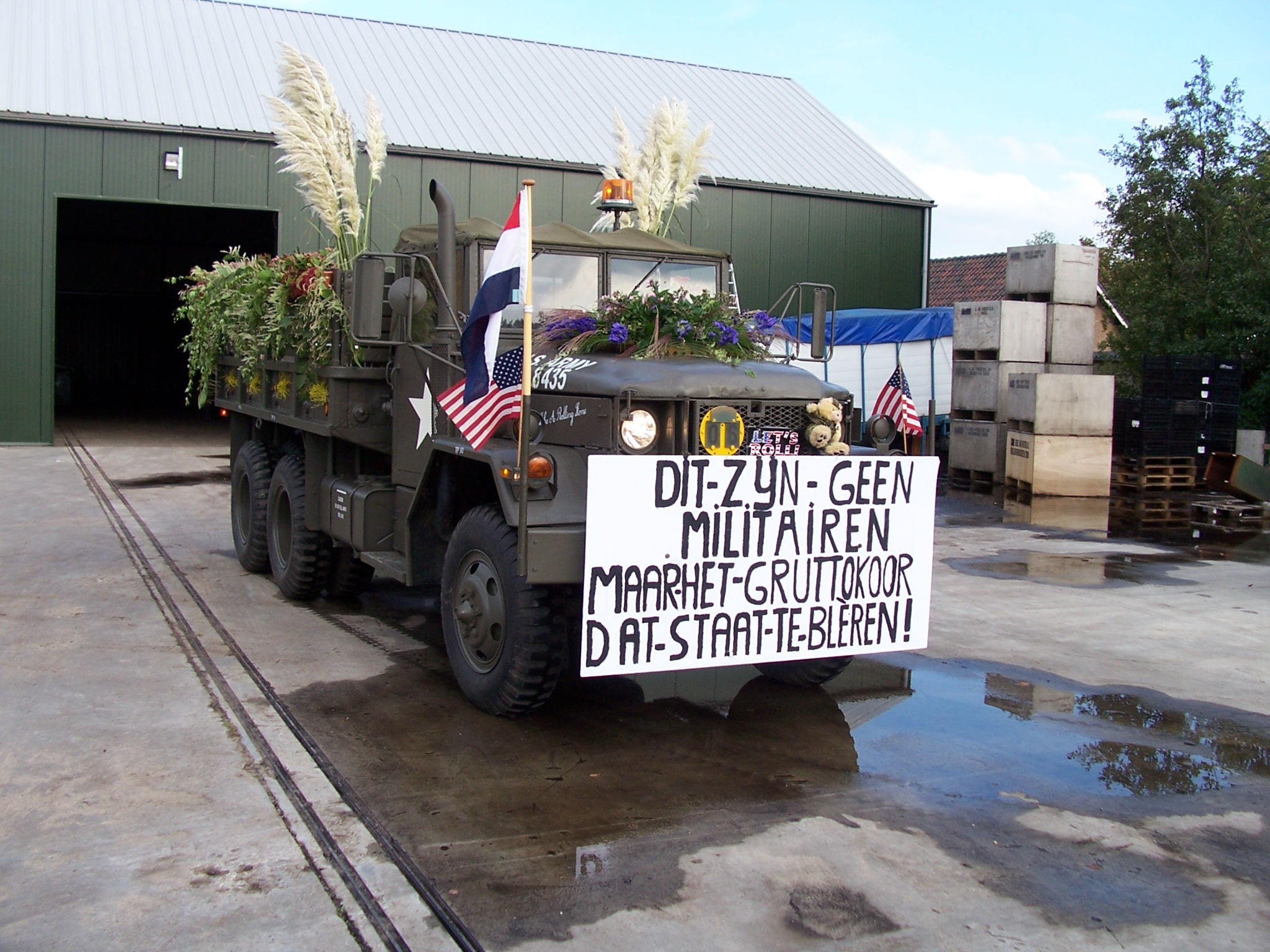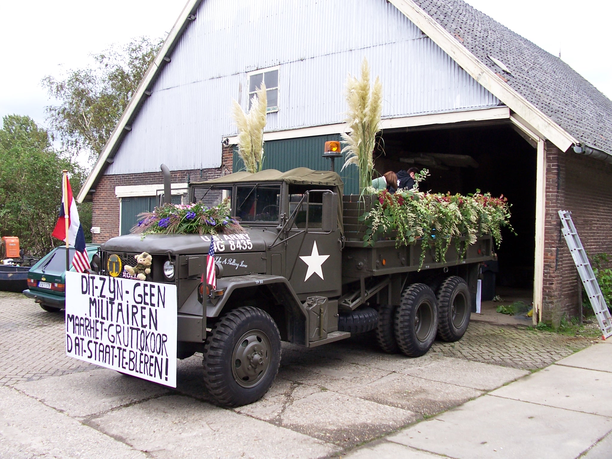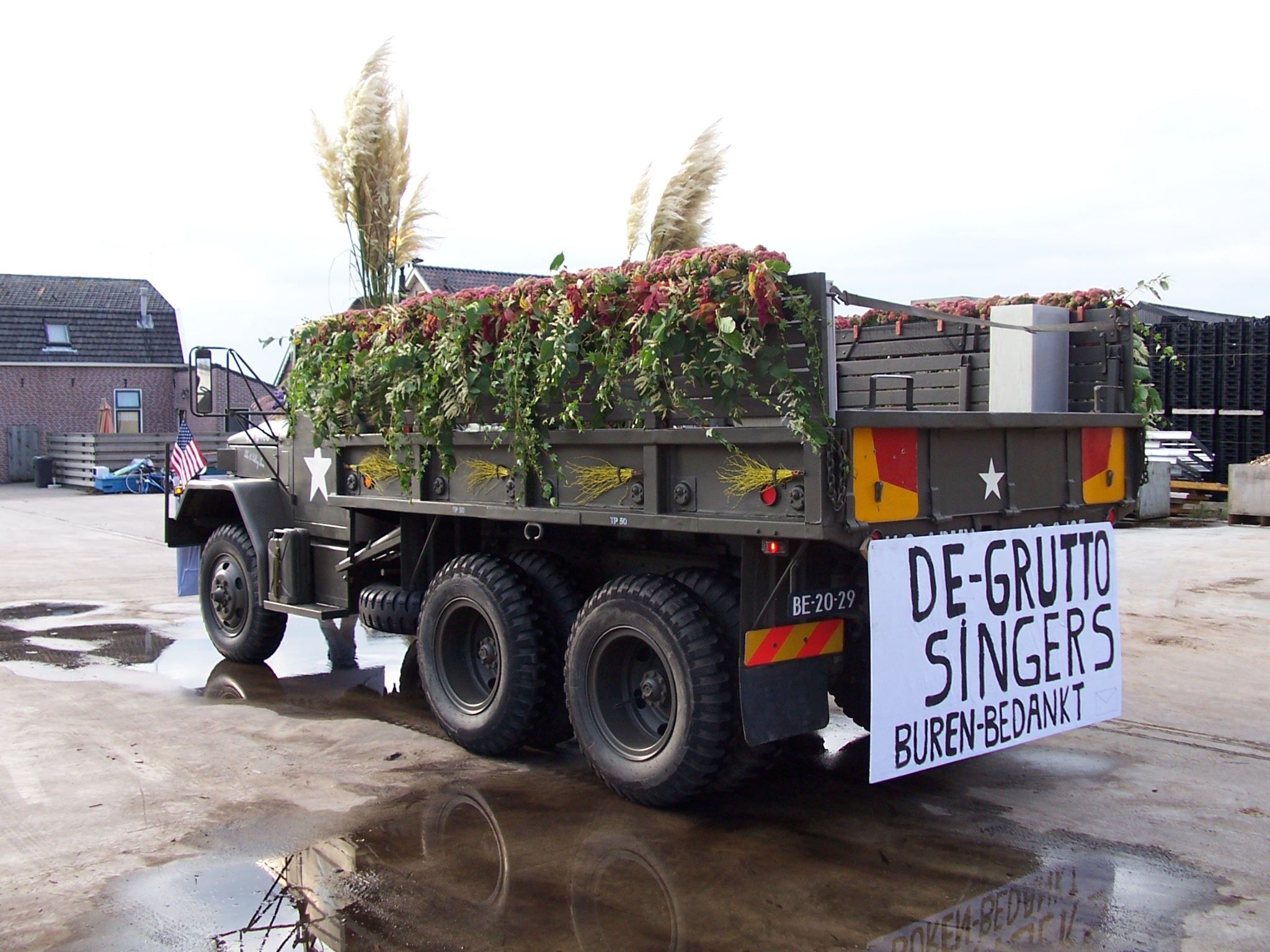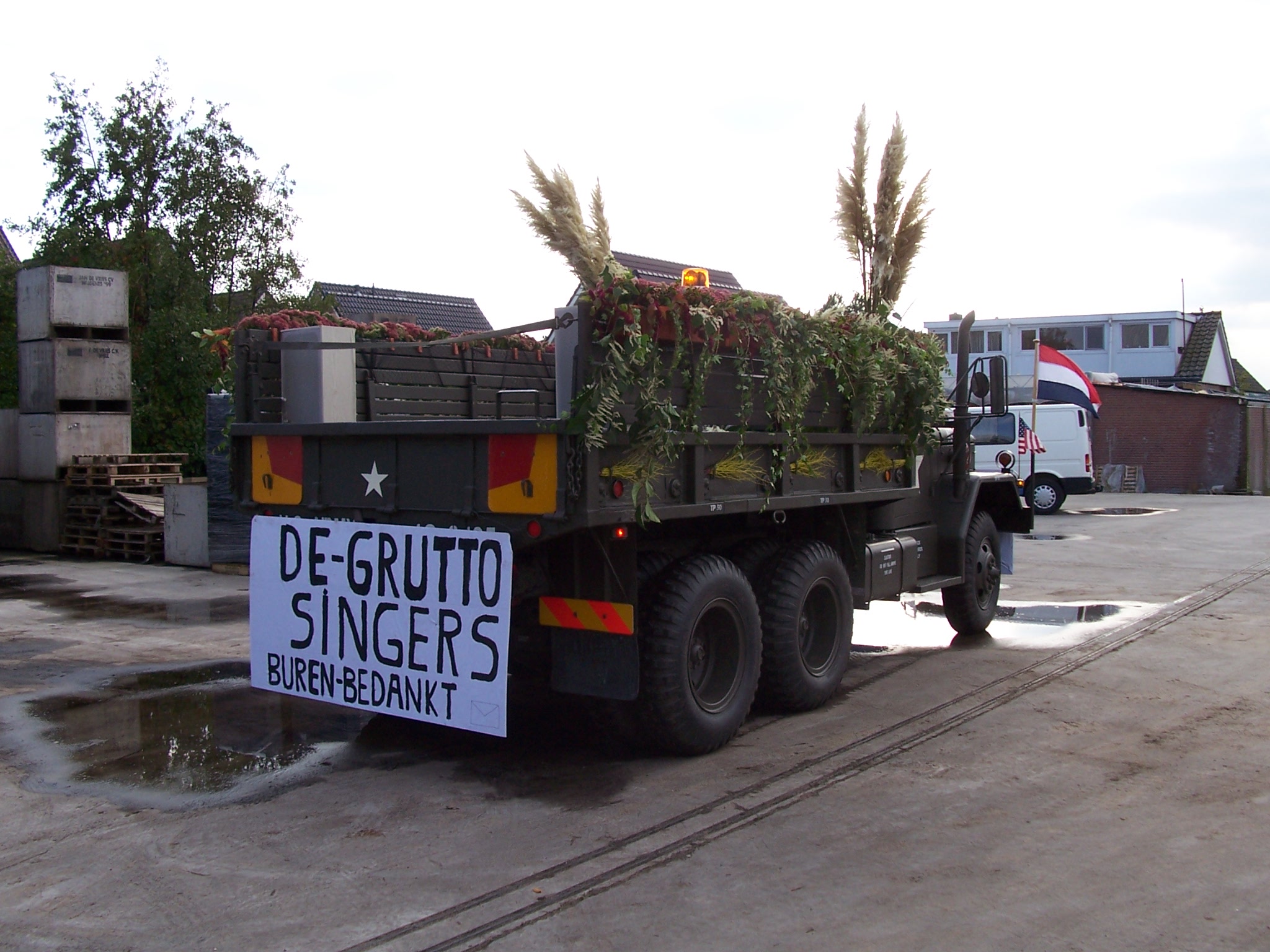 Vervolgens hebben we de truck vrijdagavond voorzichtig naar het punt gereden waar de corso begint. We mochten van een aardige kweker de truck binnen in zijn grote schuur zetten. We stonden naast de corsowagen van de oranjevereniging. Zo waren we zaterdagmorgen lekker op tijd bij de start van het corso. Wat foto's bij de kweker.