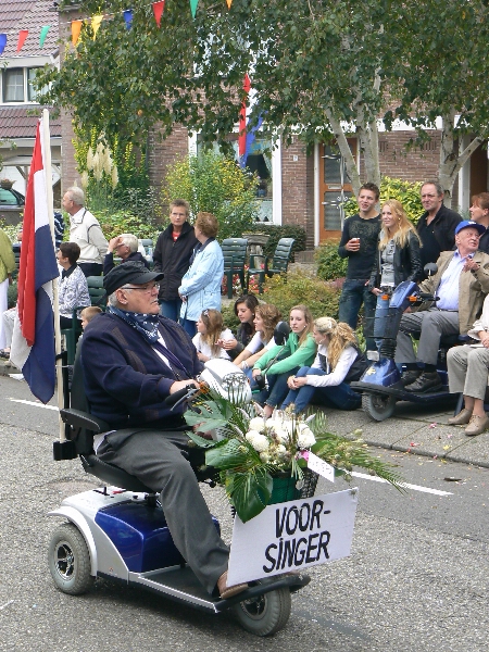 De man in de scootmobiel is onze oude buurman Arie, die we hadden belooft dat als we meedoen dan mag jij voorop rijden. Onze "voorsinger".
