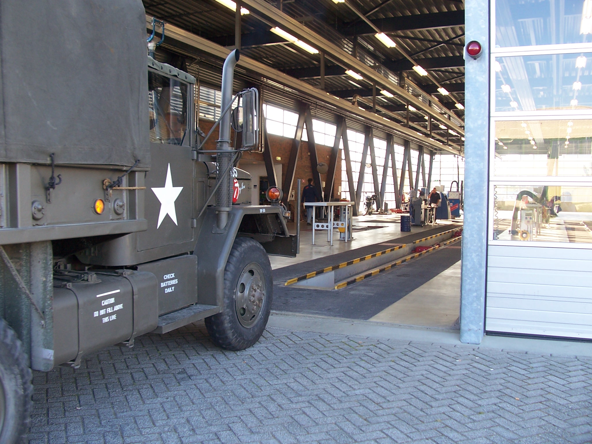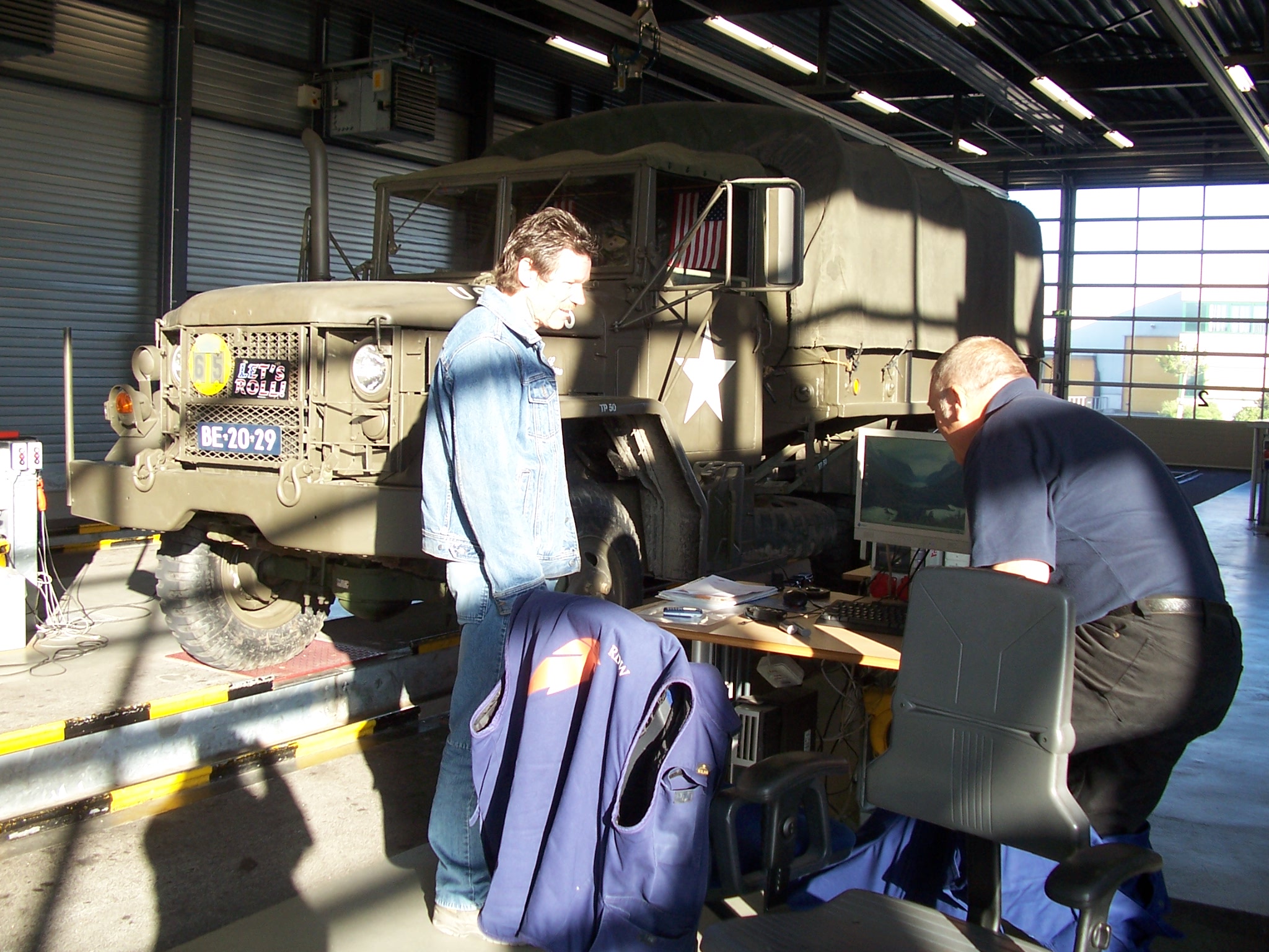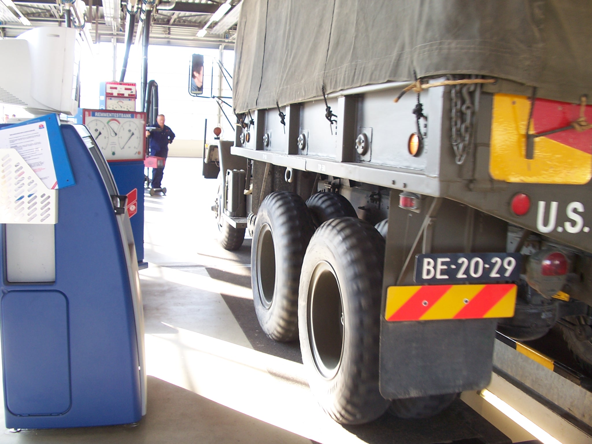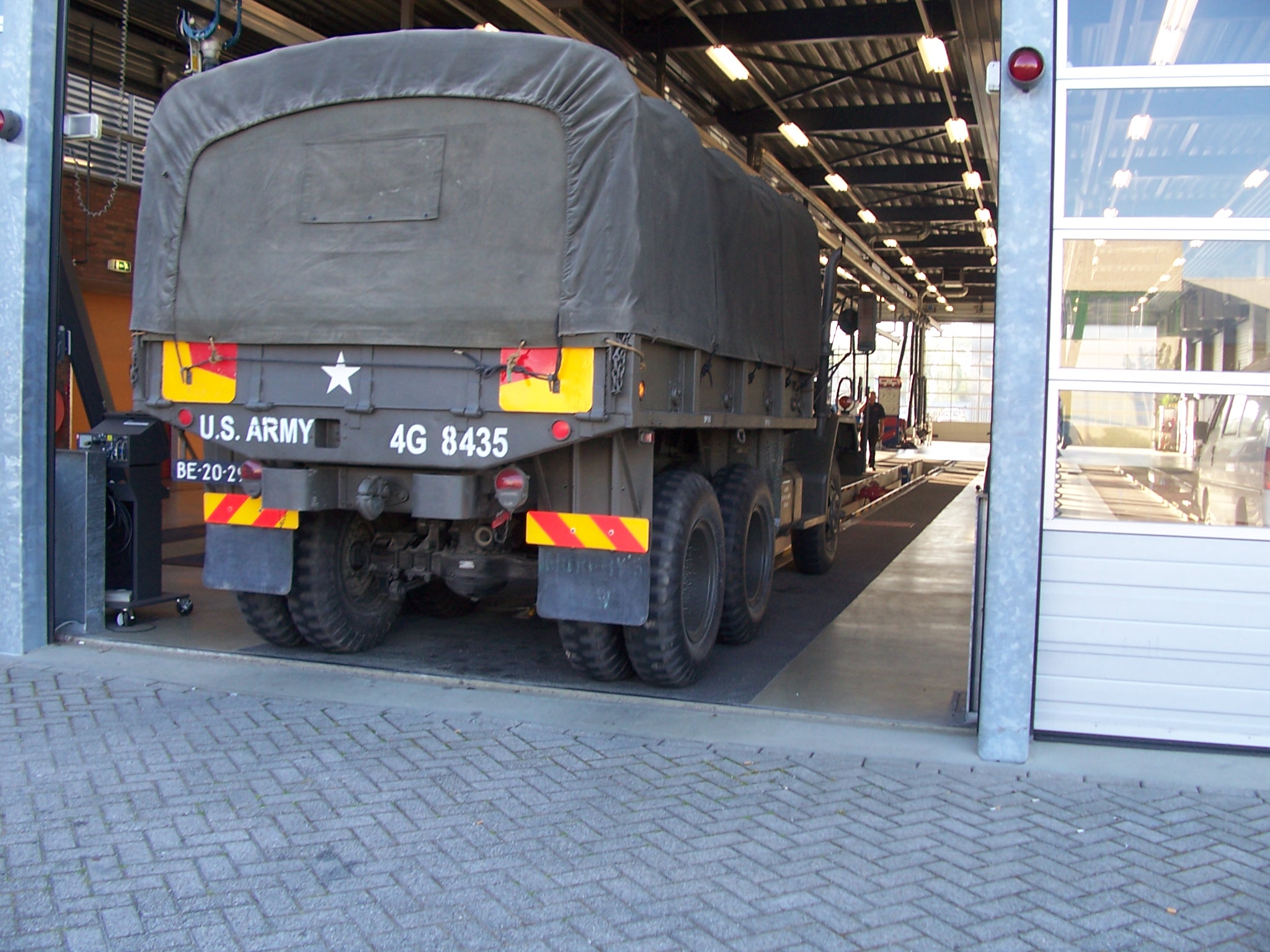 Daarna even kijken of de koplampen goed afgesteld staan. Daar hebben ze een mooi apparaat voor wat in hoogte verstelbaar is en wat ze voor de wagen plaatsen, waren het niet dat die niet hoog genoeg komt. (zie linker foto links.) De keurmeester staat er naast. Ik heb uitgelegd hoe ik de koplampen heb afgesteld en dat was voldoende. Daarna nog even wegen.